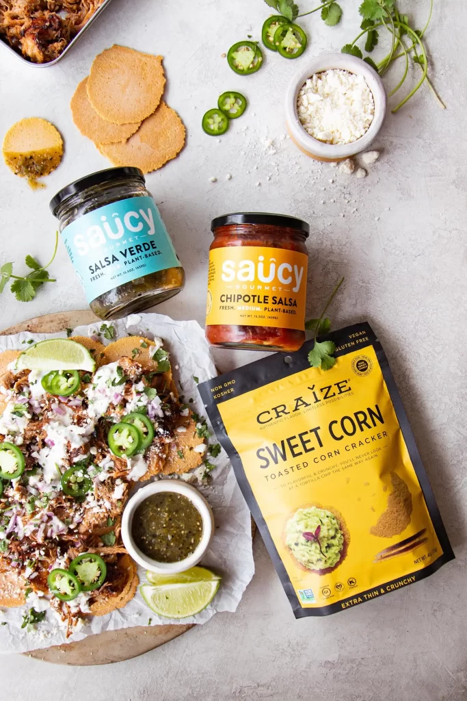 6. To assemble, place the sweet corn crackers on a serving platter. Top with the braised and broiled carnitas, crema, cotija, red onion, cilantro, jalapeno, and lime wedges. Serve alongside salsa verde if desired and enjoy!