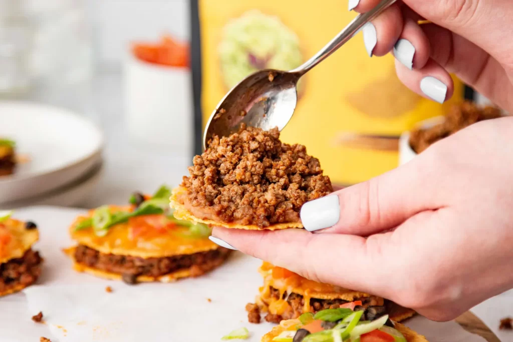 - Place a dollop of refried beans onto one side of a cracker and place on the prepared baking sheet. Place a generous spoonful of the ground taco meat on top of the refried beans. Take another cracker, and spread a dollop of beans onto one side, then place on top of the ground beef, forming a “sandwich”.