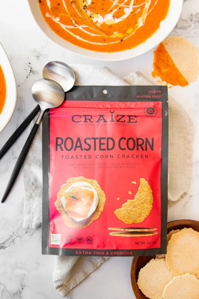 5. Ladle into serving bowls and top with crushed or whole roasted corn Craize crackers and a drizzle of olive oil and coconut cream!